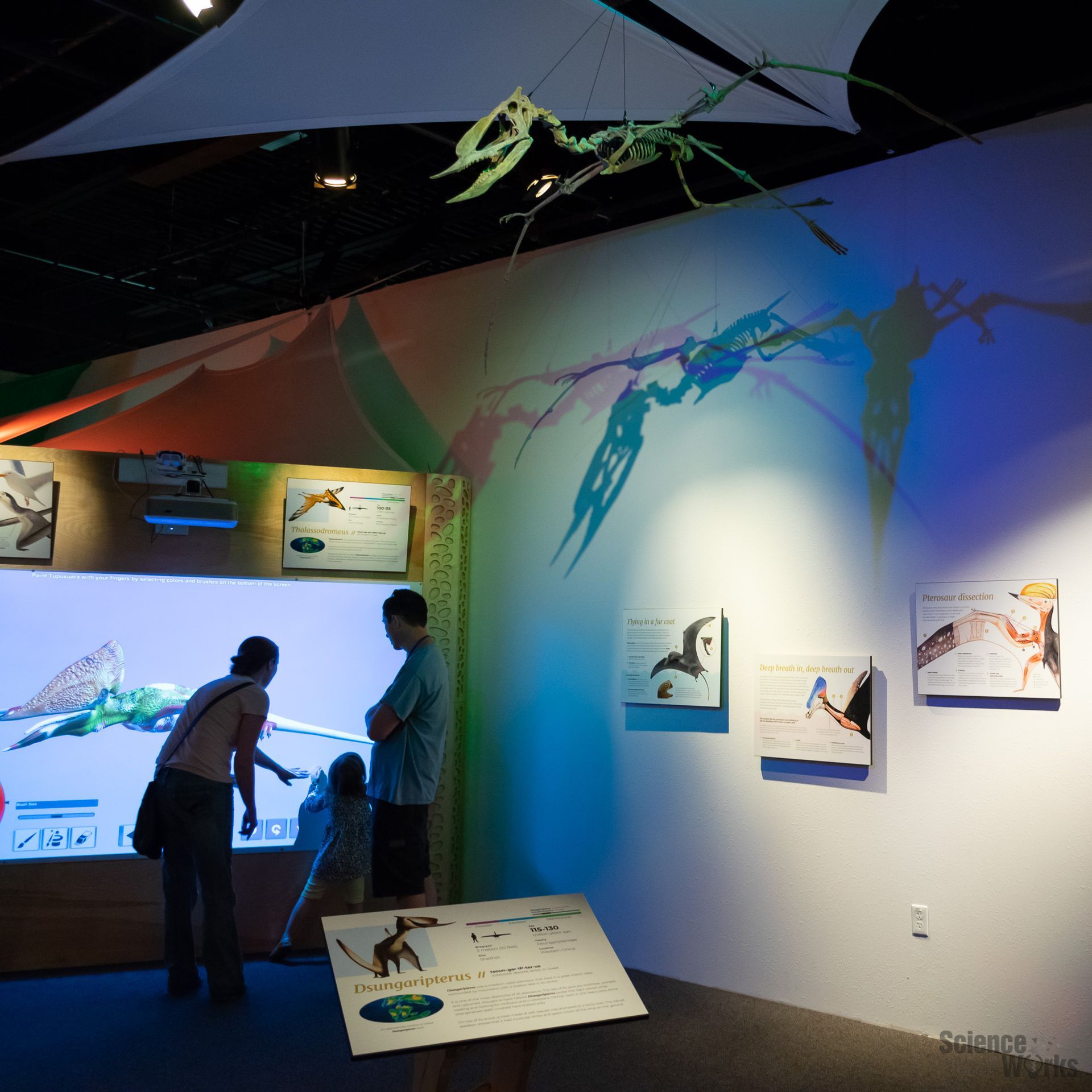 Виставка птерозаврів ідеально підходить для учнів будь-якого віку. Сім'ї та окремі особи зможуть дізнатися про цих захоплюючих і візуально вражаючих тварин різними способами. Репліки копалин супроводжуються табличками з інформацією та ілюстративними прикладами. Технологічні станції містять інтерактивні проекції та голографічні зображення. Відвідувачі також дізнаються, чим руки птахів, кажанів і птерозаврів відрізняються від їхніх власних, і спостерігають, як ці неймовірні тварини піднімаються в повітря з місця. Відвідувачі також дізнаються, чому багато птерозаврів мали величезні та різнокольорові голови та чому самці та самки могли виглядати по-різному (статевий диморфізм). Глядачі подорожують цим стародавнім світом, щоб побачити, де жили птерозаври, що говорять нам форми їхніх черепів про те, як вони вписувалися в навколишнє середовище та що вони їли.