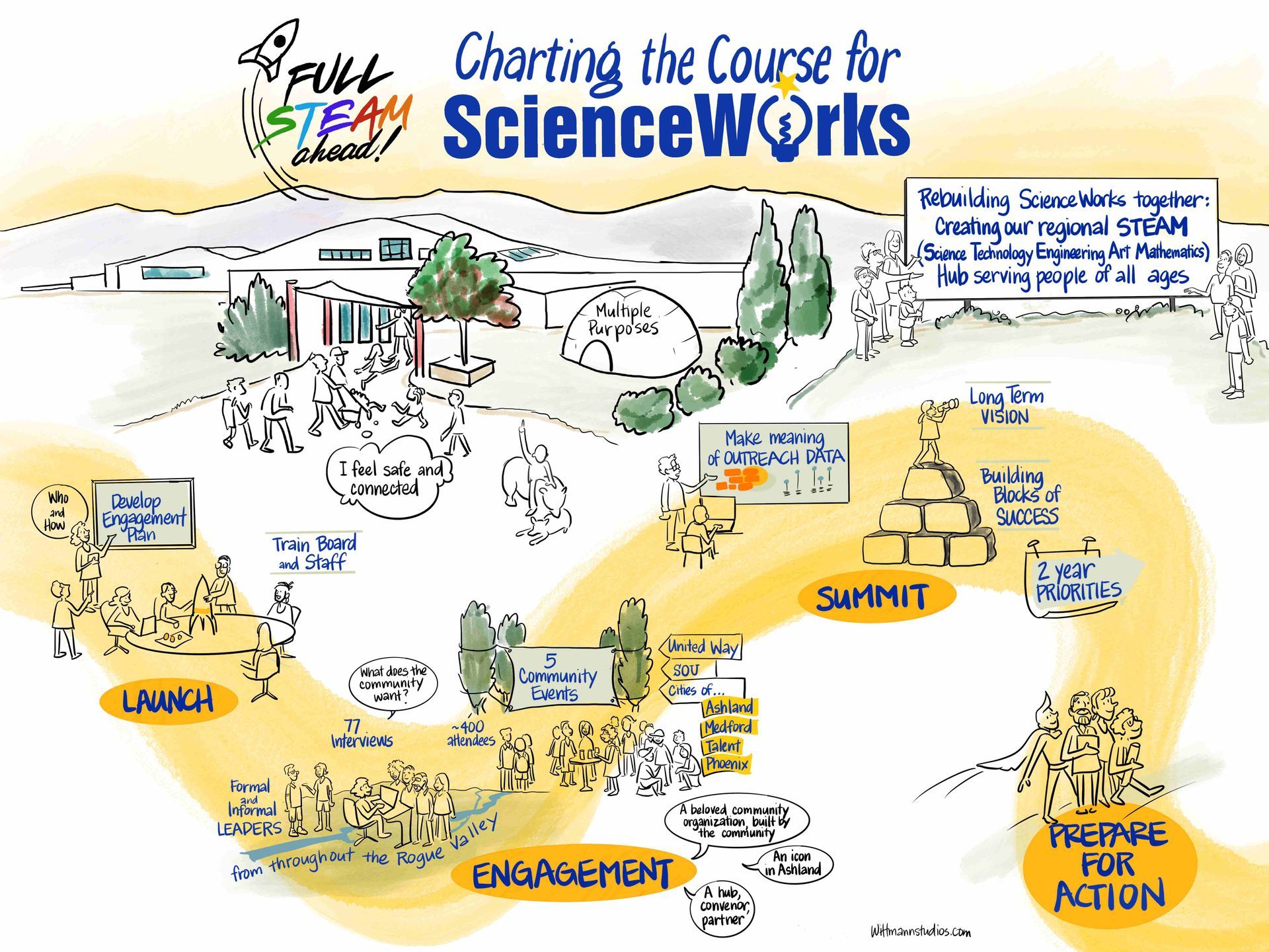 This drawing by artist Kriss Wittman illustrates the strategic journey we’ve traveled with our community this year. We interviewed dozens of community members and leaders of partner organizations, inviting them to share their thoughts and hopes for what ScienceWorks should strive toward in the coming years. We heard that you want us to be a central hub for the community, actively partnering with organizations across Southern Oregon. Your insights are shaping our strategic plan and preparing our staff and Board to support our community in the ways most meaningful to you. Follow the path of our journey and see how your ideas are guiding ScienceWorks into the future.